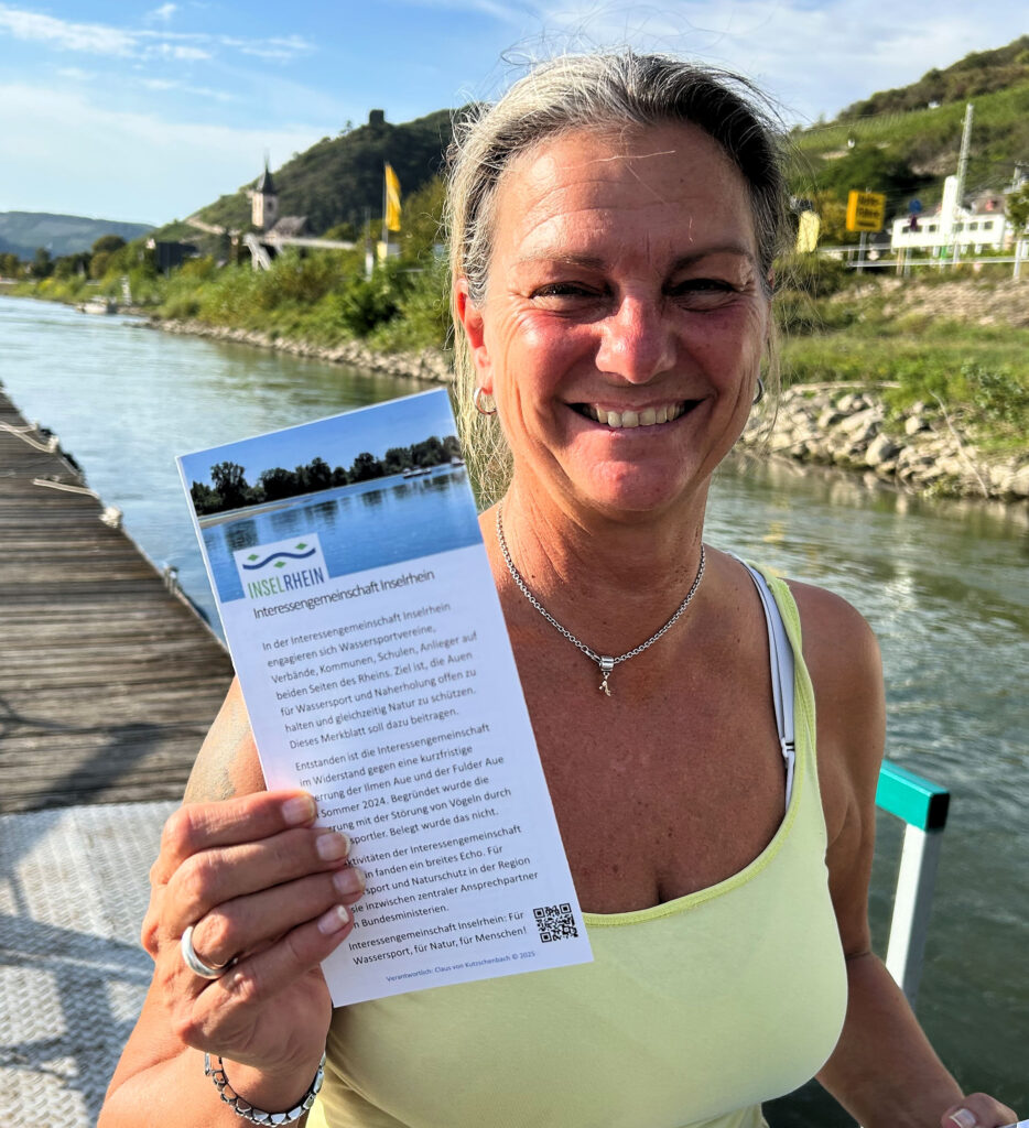 Nicole Schuh (Foto), Wassersportverein Lorch e.V., will Flyer der Interessengruppe Inselrhein vor Ort verbreiten. Sie ist auch bei den Bugafreunden engagiert.