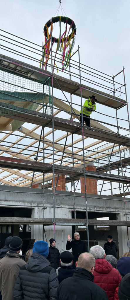 Freitag, 23. Januar, Ingelheim: Hoch oben der Richtkranz und ein Mitarbeiter der Baufirma, der geduldig wartet, bis unten die Ansprachen gesprochen sind und er selbst seinen Spruch loswerden kann.